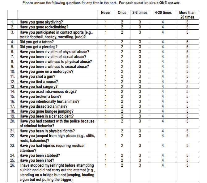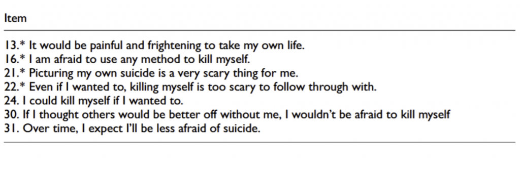 Grunewald, W., Perkins, N. M., Jeon, M. E., Klonsky, E. D., Joiner, T. E., & Smith, A. R. (2024). Development and validation of the Fearlessness about Suicide Scale. Assessment, 31(6), 1189–1203.
