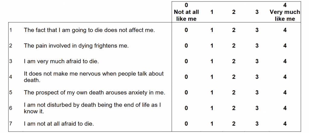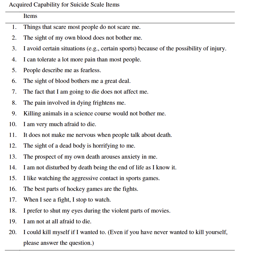 Ribeiro, J. D., Witte, T. K., Van Orden, K. A., Selby, E. A., Gordon, K. H., Bender, T. W., & Joiner, T. E., Jr. (2014). Fearlessness about death: The psychometric properties and construct validity of the revision to the Acquired Capability for Suicide Scale. Psychological Assessment, 26(1), 115–126.