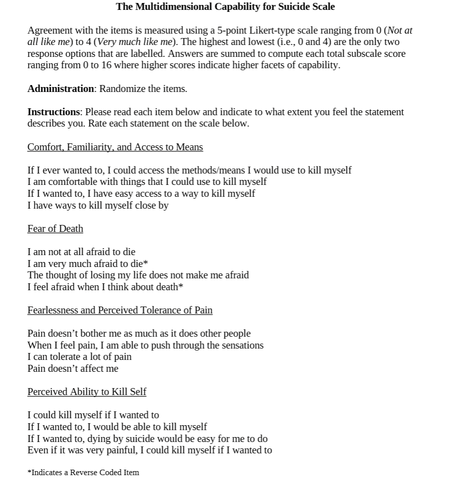 Robison, M., Campione, M., Joiner, T. E., Gallyer, A. J., & Rogers, M. L. (2025). Development and Validation of a Multidimensional Capability for Suicide Scale: A Multi-sample investigation. Assessment, 10731911251359456. Advance online publication.
